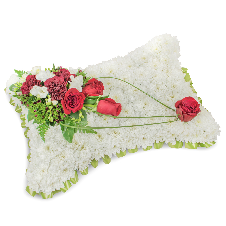 Share your heartfelt condolences with our elegant condolence bouquet, featuring a refined selection of white chrysanthemums, radiant red roses, fragrant white freesias, rich dark red carnations, delicate dianthus, and bear grass.