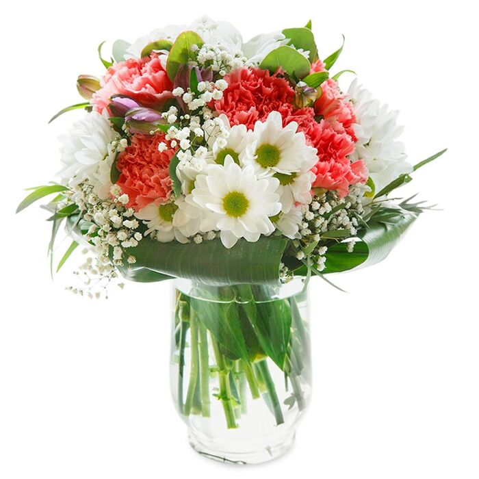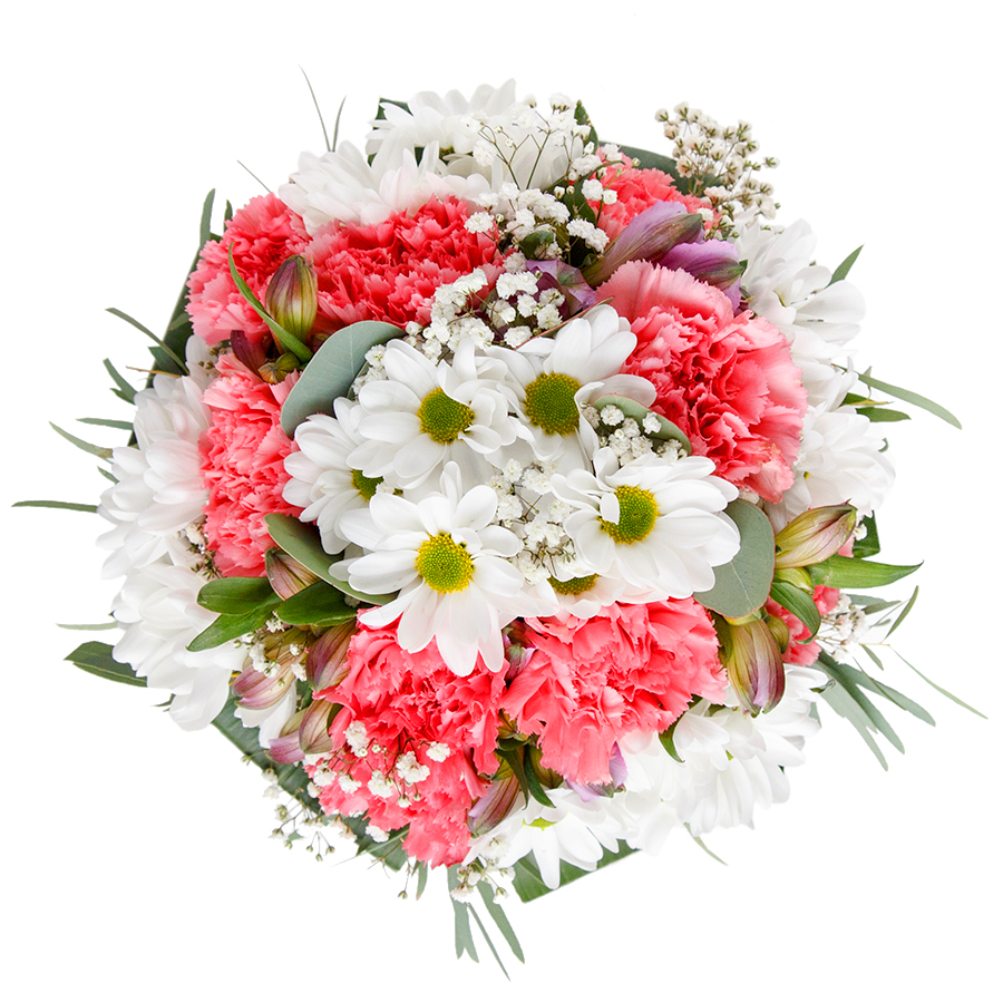 Brighten any occasion with our lovely and unique flower bouquet. This arrangement features a delightful mix of white chrysanthemums, delicate gypsophila, and soft light pink carnations, elegantly arranged with aspidistra leaves.